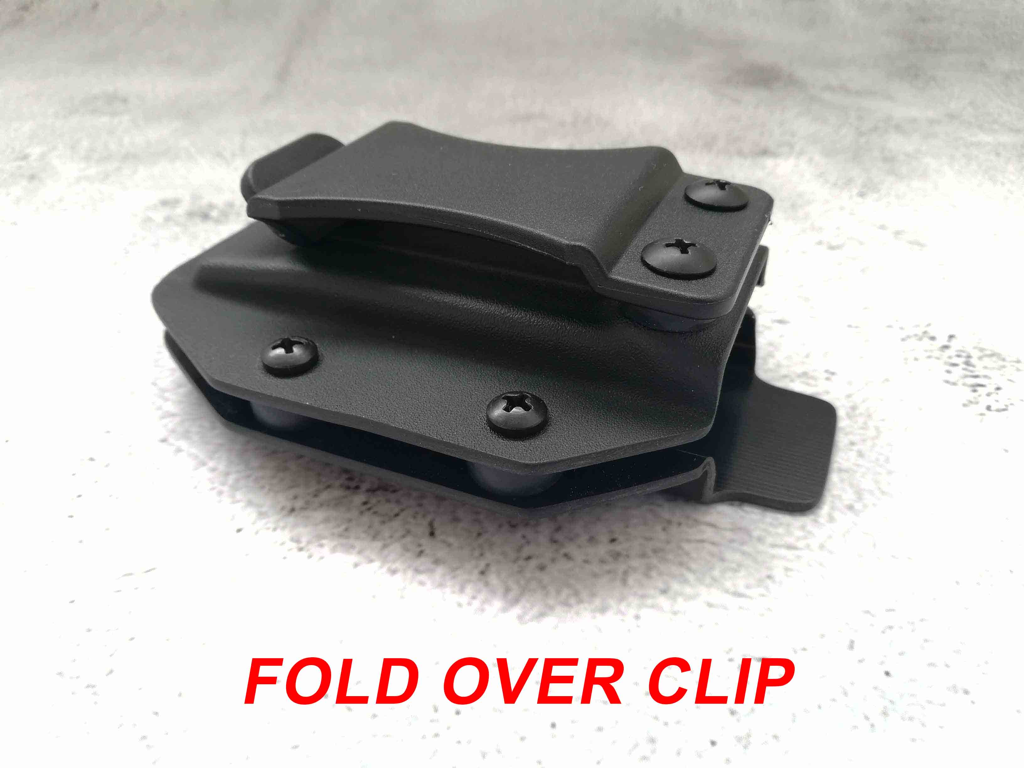 U pouzder IWB používáme plastové Fold over clips pro šířky pásků 40 a 45 mm (vždy tam je rezerva a lze použít i trochu širší pásek), kovové monoblock gear clips pro šířku pásku 40 mm nebo přímo k uchycení na kalhoty a kovové Ulti Tuck spony pro uchycení přímo na kalhoty (alternativa ULTI CLIPu). Veškerý tento hardware umožňuje rychlé nasazení pouzdra bez nutnosti vyvlékání pásku z poutek kalhot. Obecně doporučujeme použití pásku.