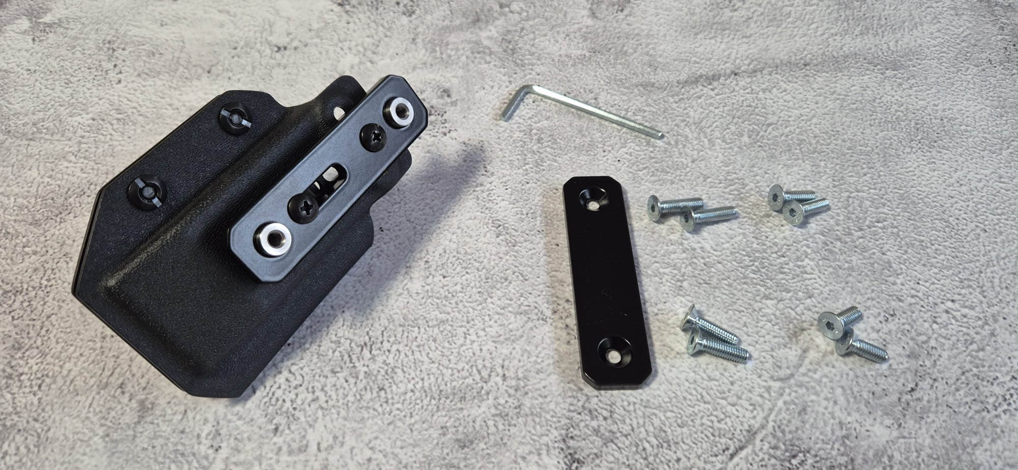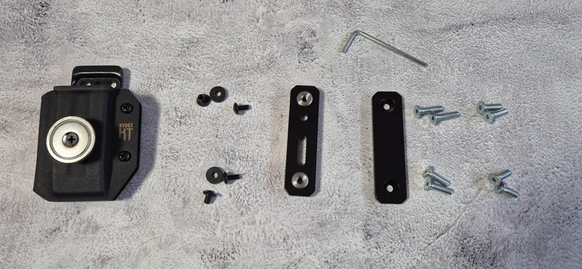 Sada obsahuje šrouby různých délek pro různě silné opasky, imbusový klíč pro montáž a sadu šroubů a podložek pro uchycení kydexového zásobníkového pouzdra na platformu. Při koupi platformy SPORT KT MAG společně s MAGNETEM pro odkládání zásobníků je šroub k instalaci v sadě také.